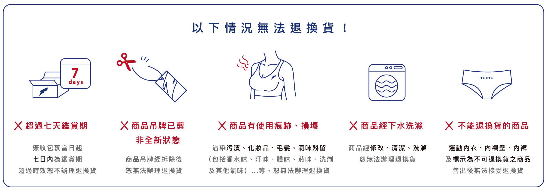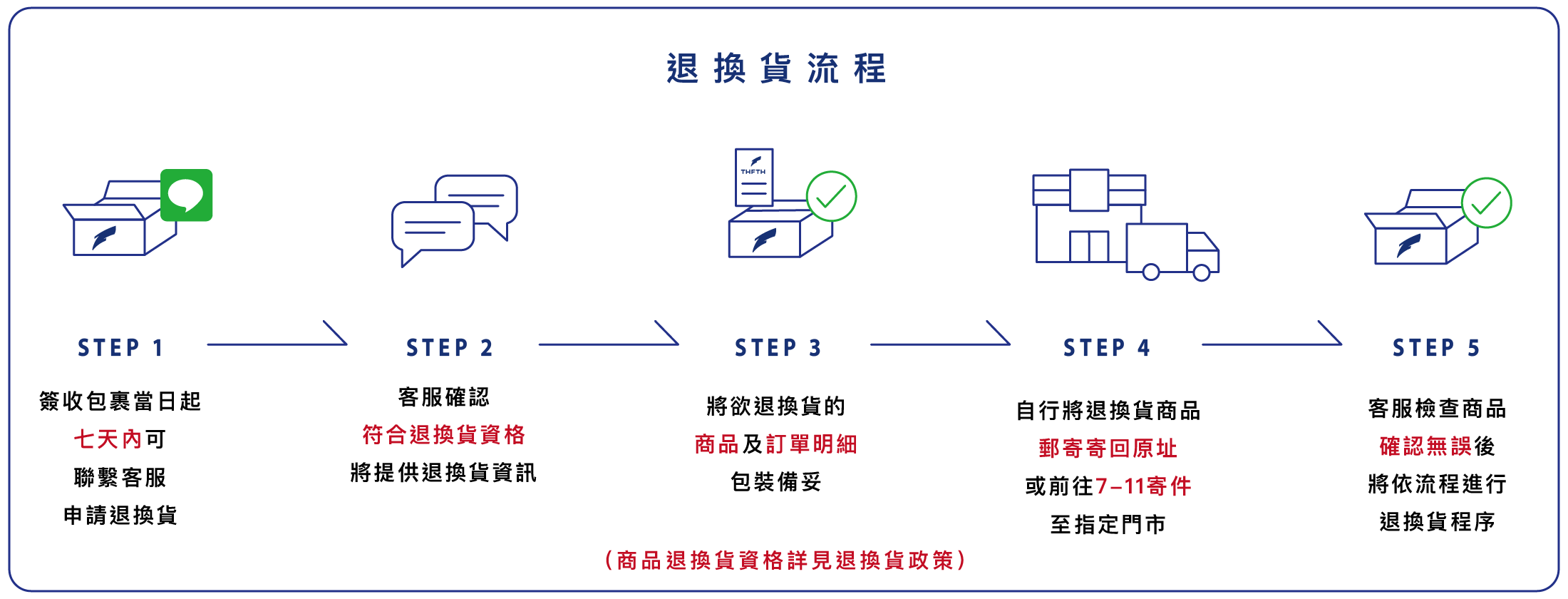 換貨:① 訂單號碼 ② 換貨品項 ③ 欲更換尺寸
